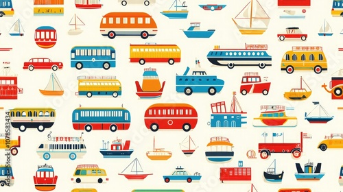 Obraz premium A seamless transportation vector pattern with colorful vehicles such as buses, trucks, and boats.