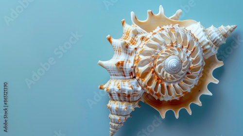 © wannathon, Obraz premium A seashell with intricate patterns, against a pale blue background.