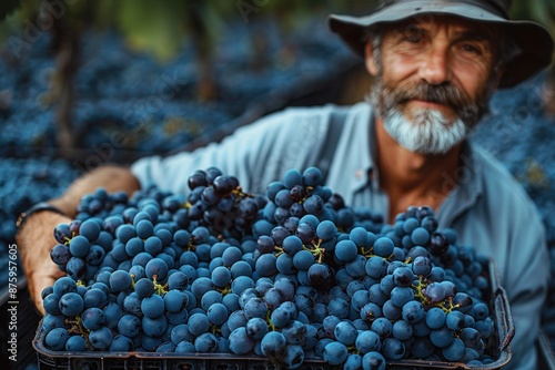 Obraz premium A seasoned grape farmer proudly holds a basket filled with ripe grapes,...