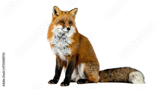 © amat, Fototapeta premium A seated fox, with reddish fur and a bushy tail, sits against a black background