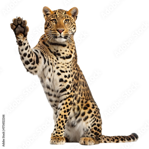 Obraz premium A seated leopard raising its paw with a black background looking directly at...