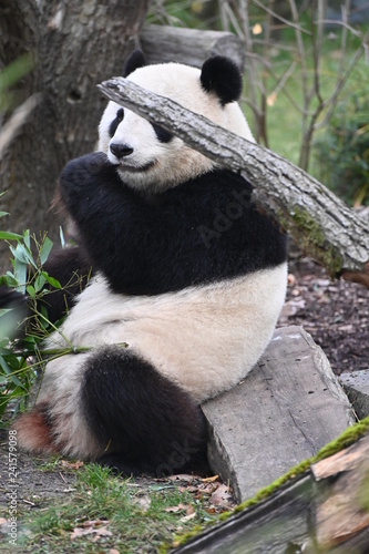 © superpapero, Obraz premium a seated panda feeds on bamboo