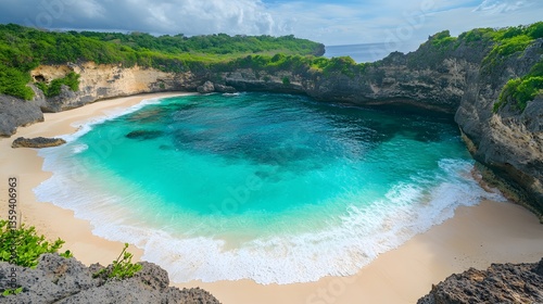 Fototapeta premium A secluded crescent-shaped bay with turquoise waters gently lapping against rugged rocky outcrops.
