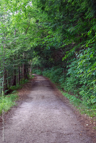 Obraz premium A secluded dirt path winds through a dense, lush green forest, inviting...