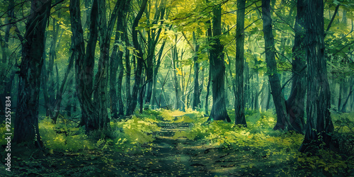© Lila Patel, Fototapeta premium A secluded forest clearing, surrounded by twisted trees and shrouded in an unnatural silence