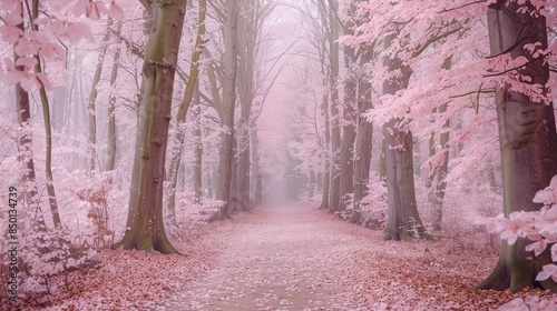 Naklejka premium A secluded forest with trees covered in pale pink leaves, the ground sprinkled with a mix of pink and light brown leaves, creating a romantic and dreamy autumn setting.
