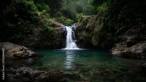 Fototapeta premium A secluded jungle waterfall cascades into a clear tranquil pool surrounded by...
