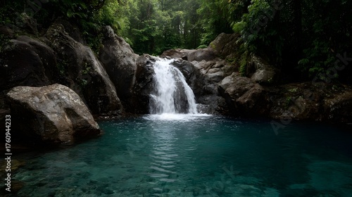 Fototapeta premium A secluded jungle waterfall cascades into a clear turquoise pool surrounded...