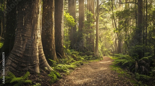 Fototapeta premium a secluded path winding through towering trees, inviting exploration and connection with nature's wonders, mystique of a hidden forest sanctuary