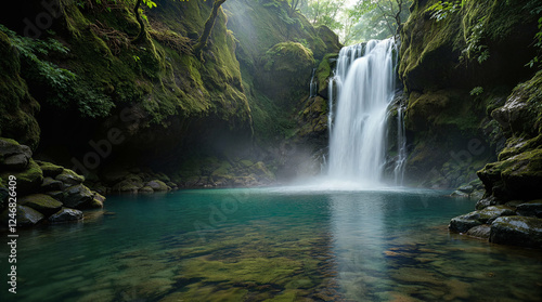 Fototapeta premium A secluded waterfall gently cascading into a still, emerald-green pool, surrounded by moss-covered rocks. tranquil and cinematic, deeply atmospheric.