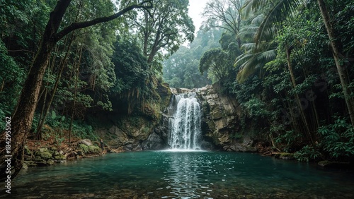 Fototapeta premium A secluded waterfall in a lush rainforest with trees and greenery surrounding...