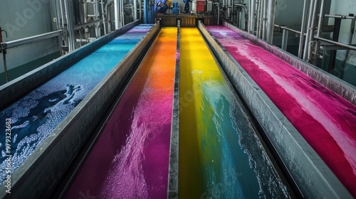 © WITTAYA ANGMUJCHA, Fototapeta premium A section of the factory dedicated to dyeing fabrics is filled with large vats of colorful dyes