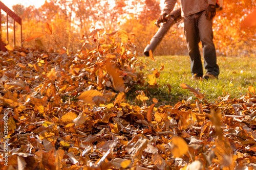 © rabbitti, Obraz premium A section of yard is cleared from a large pile of fallen leaves