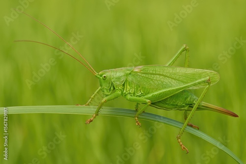 © AkuAku, Fototapeta premium A seldom-seen female green bush-cricket moving across a grass blade