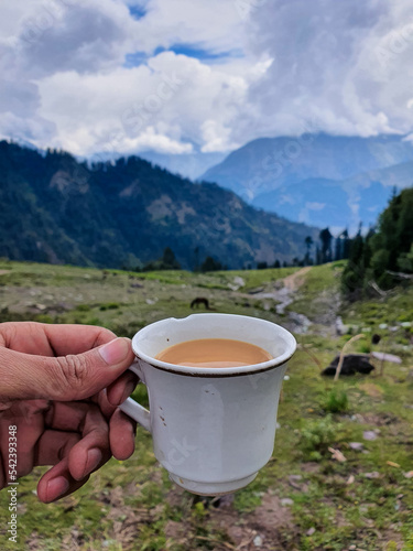 © Nauman Samtia, Obraz premium A selective focus on Tea Cup at Blur Top Mountain View of Kalam Valley in Clouds