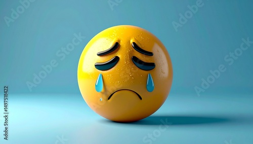 Fototapeta premium A semi-realistic crying emoji with teardrops, against a muted blue background...