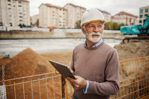 © Dusan Petkovic, Fototapeta premium A senior architect is visiting construction site and using tablet.