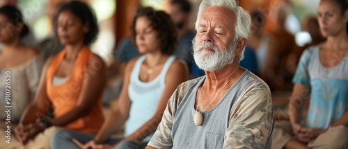 © Sukifli Dakheng, Fototapeta premium A senior leading a wellness retreat, focusing on mindfulness, yoga, and meditation for all ages