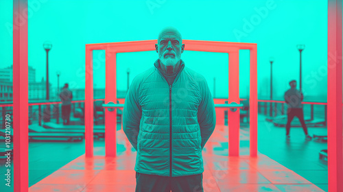 Fototapeta premium A senior man stands with his hands behind his back in front of an outdoor gym.