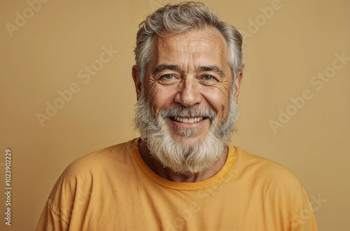 Obraz premium A senior man with a gray beard and friendly expression, smiling against a plain yellow background