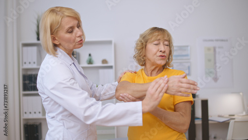 © Synthex, Fototapeta premium A senior woman endures difficulties while doing rehabilitation exercises with a doctor in a clinic