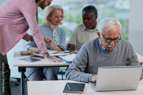 © chika_milan, Fototapeta premium A senior woman is smiling while having a retraining class with a multicultural group of senior people in the classroom.