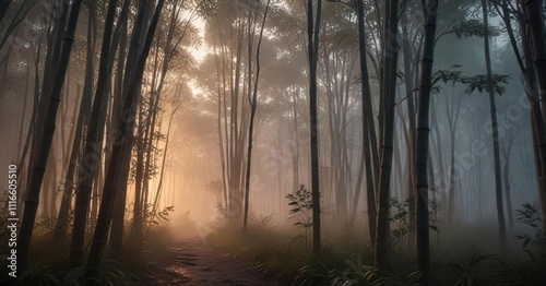 Obraz premium A sense of stillness pervades a misty bamboo grove at dawn, misty atmosphere,...