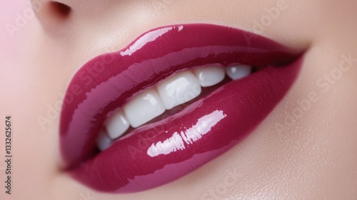 © Sergey, Obraz premium A sensual macro shot of plump lips covered in a berry-toned juicy gloss, with soft reflections enhancing the shape and texture.
