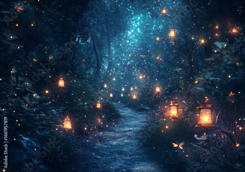 Naklejka premium A separate world deep in the forest is accessible via a winding path, perfect for inspiring fairy tale illustrations or wallpaper, with a magical atmosphere and fireflies that light up the night