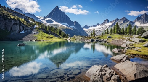© Cloudyew, Fototapeta premium A serene alpine lake surrounded by rugged peaks
