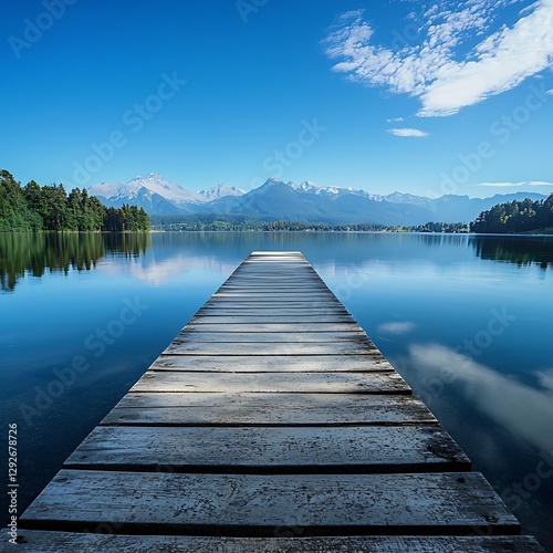 © Zri, Fototapeta premium A serene alpine lake with a wooden pier extending into the still water under a clear blue sky