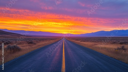 Naklejka premium A serene and breathtaking view of a long road stretching into the horizon during a vibrant sunset in a tranquil landscape