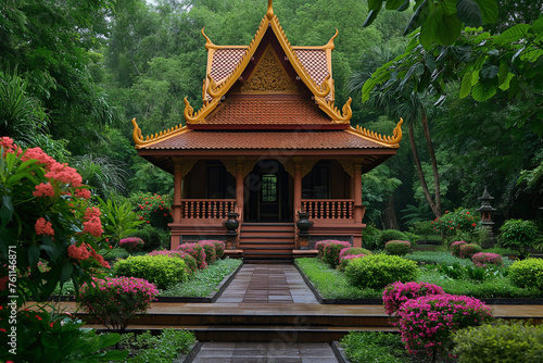 Fototapeta premium A serene and elegant scene with a blend of Thai architectural elements....