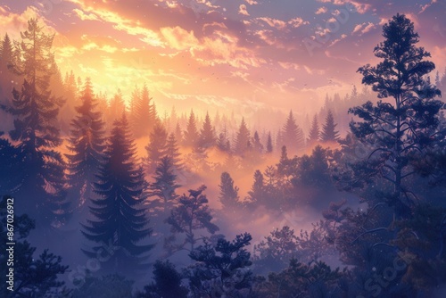 Naklejka premium A serene and mystical forest landscape at dawn, with trees silhouetted...