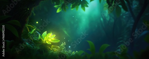 Fototapeta premium A serene and mystical forest scene illuminated by soft light, showcasing vibrant plants and lush greenery in a tranquil setting.