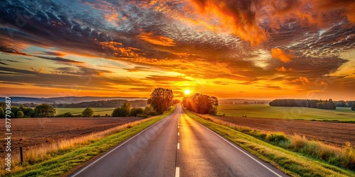 © Man888, Naklejka premium A serene and peaceful rural landscape with an empty road stretching into the distance, illuminated by a warm and vibrant orange sunset sky.