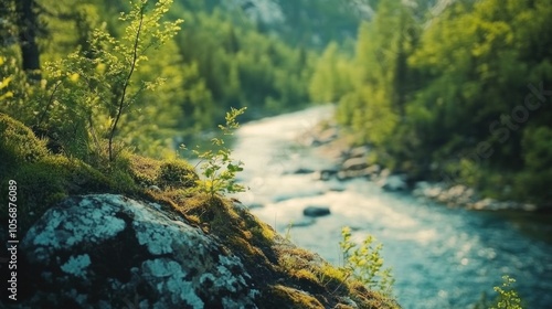© Vii, Fototapeta premium A serene and peaceful scene of a river winding its way through a dense and vibrant green forest