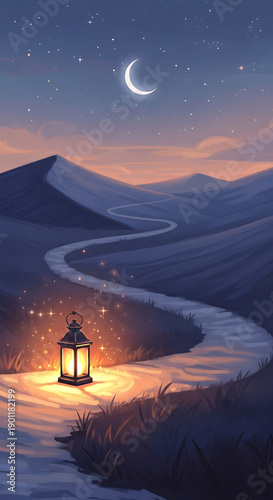 Fototapeta premium A serene and peaceful vector illustration of a lantern on a winding path under a starry night sky with a crescent moon Ramadan