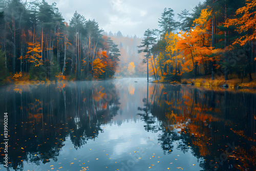 © NE97, Naklejka premium A serene and surreal lake with reflections of trees, creating a tranquil and calming atmosphere. Suitable for nature, relaxation, and scenic use.