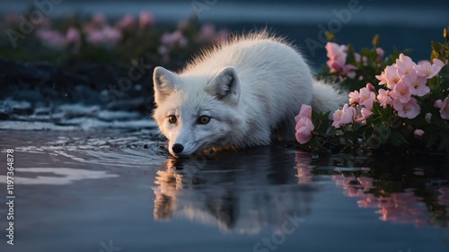 © Euis, Naklejka premium A serene arctic fox wading through water surrounded by pink flowers at sunset.