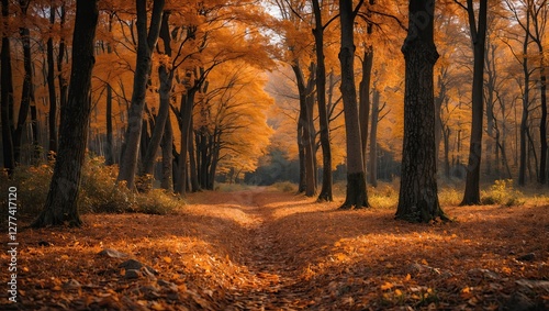 Obraz premium A serene autumn forest pathway covered in orange and yellow leaves amidst tall trees