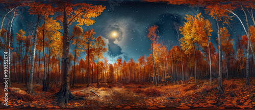 © Ratchpon, Naklejka premium A serene autumn forest scene with vibrant orange leaves, glowing moon, and starry sky, evoking sense of tranquility and wonder.