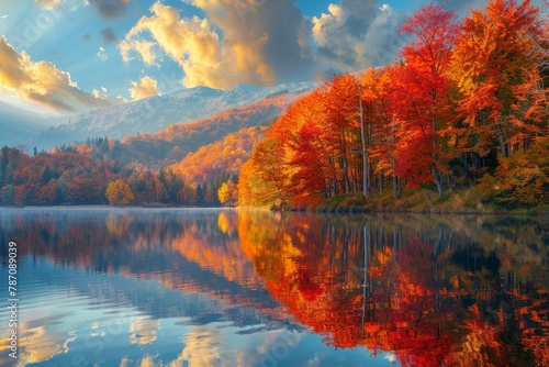Naklejka premium A serene autumn landscape with a crystal-clear lake reflecting vibrant,...