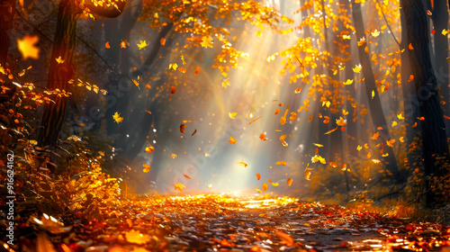 Naklejka premium A serene autumn landscape with a path covered in golden leaves. The forest is illuminated by the soft rays of the sun, with leaves gently falling, creating a magical atmosphere.