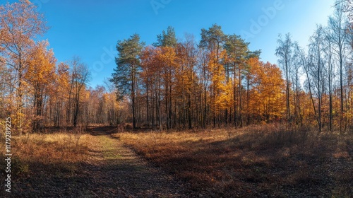 Fototapeta premium A serene autumn landscape with colorful trees under a clear blue sky.