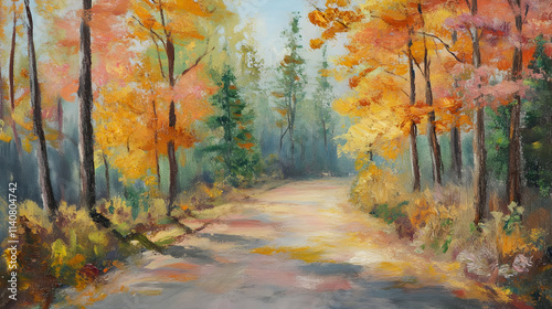 © madang, Obraz premium A serene autumn landscape with vibrant foliage and a winding path.
