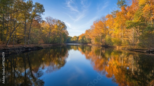 Fototapeta premium A serene autumn landscape with vibrant foliage reflecting on calm water under...