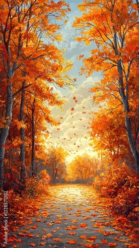 © darion, Obraz premium A serene autumn landscape with vibrant orange foliage and a tranquil pathway.