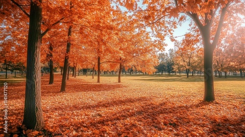 Fototapeta premium A serene autumn landscape with vibrant orange leaves covering the ground.
