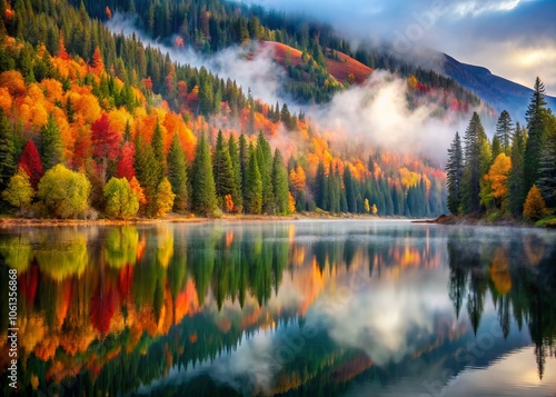 © Curie, Fototapeta premium A serene autumn morning at Lake Josephine, Montana, features mist over peaceful waters, vivid fall leaves reflecting in a tranquil landscape, captured in long exposure.
